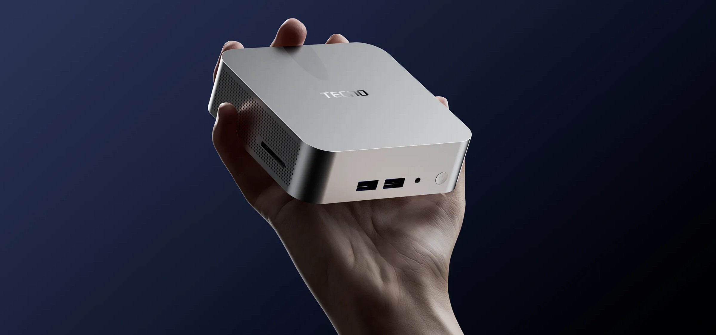 Tecno Mega Mini M1 выполнен в компактном алюминиевом корпусе с аккуратной матовой отделкой. Форм-фактор рассчитан на размещение прямо на рабочем столе или за монитором, при этом устройство занимает минимум места. Габариты 112 × 112 × 37 мм и вес 410 г делают мини-ПК удобным для мобильного рабочего пространства, домашнего офиса или переговорной.