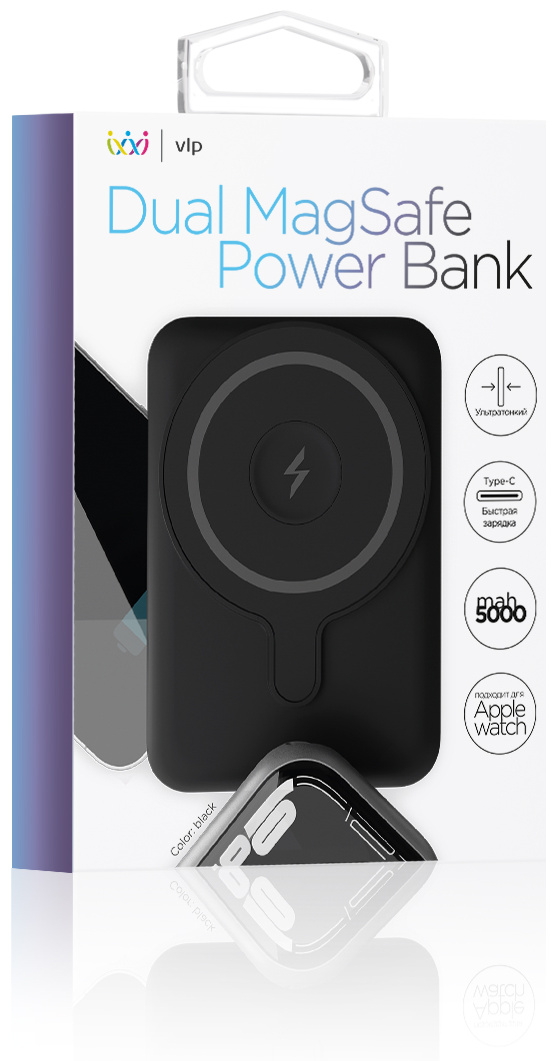 Внешний аккумулятор VLP Dual MagSafe с поддержкой беспроводной зарядки — незаменимый помощник, который позволит одновременно зарядить смартфон и смарт-часы. Устройство поддерживает протоколы быстрой зарядки. Емкость аккумулятора составляет 5 000 мАч, этого достаточно, чтобы полностью зарядить смартфон.